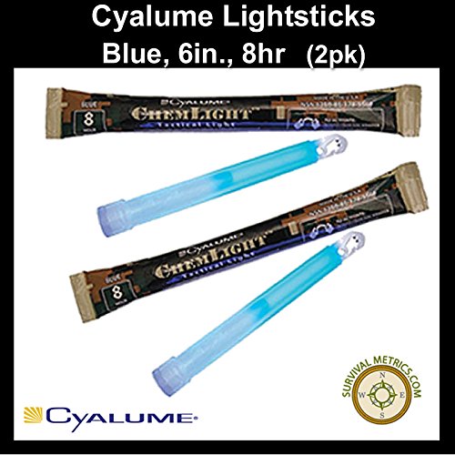 Field tested and proven effective. The dependable 6 inch ChemLight is easy to use, easy to identify and dispose of when in emergency situations. 6 inch ChemLights provide 360 degrees of light. The 6 inch ChemLight is recommended for use during evacuations, power outages, camping, auto safety, and utility work. Perfect for survival, first aid, and evacuation kits as they produce no heat, spark, or flame. Individually foil-wrapped for light and moisture protection. Providing up to 8 hours of illumination. Hook and Gate attachment make it easy to attach to lines, clothing, and more. Made in the USA without any Pthalates (unlike cheaper Chinese versions). Flashlights fail and batteries die, but ChemLights will not. Be sure you are ready with a good supply of American Made Chemlights by Cyalume.