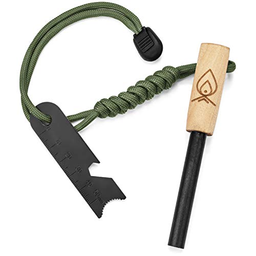 • INCLUDED SURVIVAL TOOL features a bottle opener, hex wrench, micro ruler, map scale and sharp spine scraper. It is affixed to the ferro rod by the 48″ braided paracord lanyard for quick easy retrieval and use.
